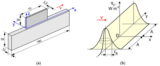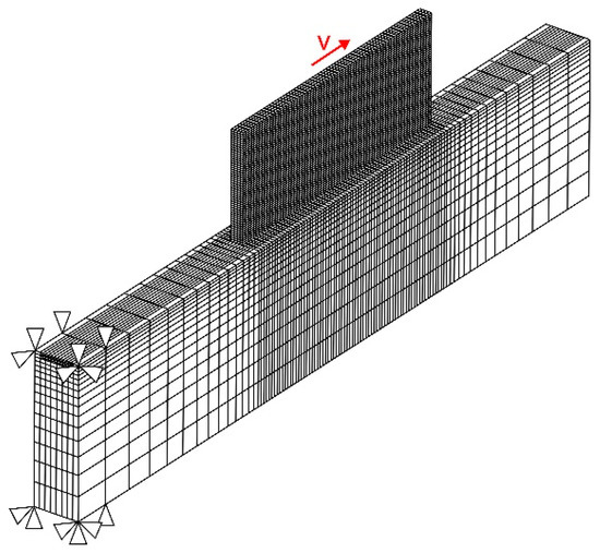 The unique characteristics of the DLD process make the description of the heat transfer boundary conditions challenging. The heat transfer from the buildup surface is governed by the local action of the concentrated gas-powder jet, as well as by the parameters of the surrounding atmosphere in the working chamber. In its turn, the forced convection parameters of the gas jet are determined by the type of the nozzle, its design features, and the gas flow rate. To the best of the authors knowledge, there are no simulation models and experimental data published, which can be used to describe the influence of all parameters on the heat transfer coefficient. In [62,63], the spatial distribution of the heat transfer coefficient for a coaxial powder feeding nozzle was experimentally established. During the buildup of active alloys, the gradual temperature increase in the chamber filled with argon affects the convective heat transfer. Significant time and resources are required to experimentally determine the influence of the mentioned processes on the heat transfer parameters. Therefore, the unknown value of the heat transfer coefficient was determined by calibration using experimentally measured temperature fields. The adopted value of the heat transfer coefficient was 100 W m−2 K−1. The boundary at the left end of the substrate was rigidly fixed in the model, as shown in Figure 7.