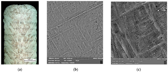 Optical metallography of etched microsamples was carried out using a Leica DMI8A microscope with a magnification of up to 1000 times. For the etching the Kroll’s reagent (1 mL HF + 2 mL HNO3 + 47 mL H2O) was used [38]. All metallographic cross-sections were taken from the middle region of the buildup. The Vickers hardness was measured according to the ISO 6507 standard on an FM-310 hardness tester (Future Tech, Kawasaki, Japan) with a load of 3 N. To determine the chemical composition and analyze the microsamples, a Tescan Mira3 scanning electron microscope (TESCAN, Brno, Czech Republic) with an Oxford AZtec console was used (Oxford Instruments NanoAnalysis, Abingdon, UK).
