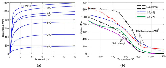 The experimentally obtained true tensile stress curves of the Ti-6Al-4V alloy for the temperature range between 20 and 800 °C are shown in Figure 3a. As seen in Figure 3b, the yield strength decreases drastically by approximately 40% as the temperature increases to 500 °C. The softening rate considerably speeds up during further heating. On the other hand, Young’s modulus remains almost constant at a temperature below 500 °C. However, it decreases drastically by approximately 70% from 109 to 26 GPa as the temperature increases to 800 °C. Comparison of obtained results with published data revealed that the obtained DLD-processed alloy shows significant thermal stability of Young’s modulus than conventional wrought alloy. It is also noteworthy to mention that the properties of the DLD-processed alloy at 800 °C coincide with these of the wrought alloy. Therefore, the data taken from [45,46,47] were used for the temperature above 800 °C.
