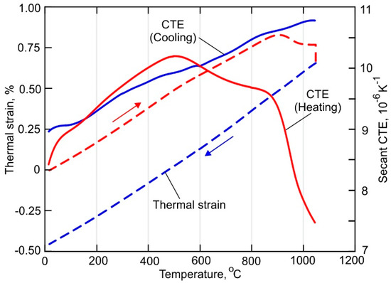 As can be seen in Figure 4, the heating and cooling parts of experimentally obtained the thermal strain curve have slightly different slopes at a temperature below 600 °C. Further heating causes a decrease of the CTE due to the diffusion-controlled phase transformation α′ → α + β [48]. Note, however, that above 800 °C the α + β → β transformation begins. According to the secant CTE curve, the transformation rate is relatively slow in the temperature range between 800 and 900 °C. At a temperature higher than 900 °C, the rate of β-phase formation sufficiently increases due to an increase in the diffusion mobility of the atoms. During holding at 1050 °C, the β-phase content reaches 100% causes a reduction of the thermal strain. The CTE continuously decreases during the subsequent cooling of the sample. The final microstructure consists of (α + β)-phase formed during the phase transformation β → α + β, which starts at 900 °C and finishes at 810 °C.