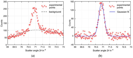 Neutron diffraction measurements were carried out on the STRESS diffractometer at the IR-8 research reactor of the Kurchatov Institute in Moscow (Russia). A double monochromator made of pyrolytic graphite (PG002) and a focusing silicon crystal (Si220) [50,51], which outputs a monochromatic neutron beam with a wavelength λ = 1.548 Å, is used. The diffraction peak α-Ti(103) of titanium at a scattering angle of 2θ ≈ 71.40° was used in the present study, as in lamellar Ti-6Al-4V, the α phase accounts for around 90% of the crystallographic planes at room temperature. The following elastic properties for the α-Ti(103) were used [52,53]: E103 = 105.5 GPa, v103 = 0.342. The size and orientation of the gauge volume were chosen to obtain a strain averaged over the thickness of the buildup wall. The gauge volume had the geometrical dimensions of 1.5(x) × 3(y) × 1.5(z) mm3. Measurements were carried out at 11 points at a distance z = 2 mm from the substrate, corresponding to the following coordinates x = (2; 3; 4; 5; 7.5; 10; 12.5; 15; 20; 30; 40) mm. The origin of the coordinate system corresponds to the buildup end at which the depositing layers are initiated, as shown in Figure 1a. The average measurement time for each strain component was approximately 45 min. A non-linear background significantly affecting the accuracy of the diffraction peak position was revealed during data processing. The background fitted by a sixth-degree polynomial was removed and the diffraction peak was approximated by a Gaussian function. The coefficients of the fitting functions in both cases were determined by a non-linear least squares method [54]. An example of the data processing is shown in Figure 5.