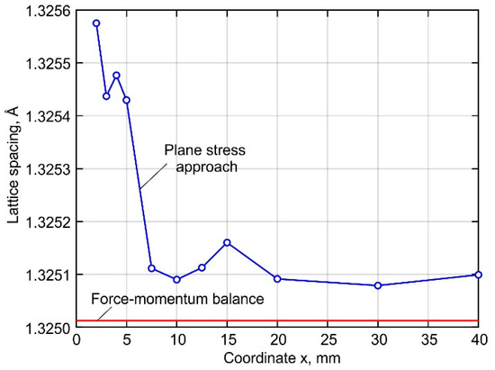The parameter do satisfying the system of Equation (5) was obtained by solving an optimization problem, assuming that the stresses at the buildup ends are equal to the yield stress of the material, and the distribution of the normal stress σz is symmetrical to the middle cross-section of the buildup. The calculation was performed using the commercial software MATLAB and the Nelder–Mead simplex method [56]. The resulting values of the stress-free interplanar spacing are shown in Figure 6.