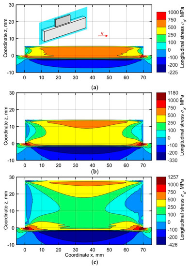 The simulated distribution of the longitudinal stresses σx in the central longitudinal-section of the buildup (located at y = 1.6 mm), corresponding to the end of the cooling stage after 10, 25, and 50 layers, are shown in Figure 8a–c. Three regions of tensile stress concentration are observed. One is formed in the recently deposited layer and its HAZ, and the other two correspond to the beginning and the end of the first layer. The mechanism of longitudinal stress formation in the first region is the same for all layers. During the deposition, a narrow area subjected to heating tends to increase its volume due to thermal expansion. Yet, the free expansion of the volume is restricted by the colder metal around it, which leads to the formation of transient compressive stress and plastic strain. During cooling, however, a thermal strain redistribution leads to a thermal contraction of this region. The surrounding cooler metal is strongly resisting the shrinkage of the deposited pass and the corresponding HAZ. Due to the typically low yield stress of metals at high temperatures, the stress will change rapidly from compressive to tensile during the beginning of the cooling stage. During further cooling, the following processes occur: the compressive stresses are replaced by tensile stresses, and the compressive transient plastic strain is partially compensated by the tensile plastic strain. Thus, a tensile stress region is formed along the entire length of the deposited layer and its HAZ. With the increase of the layer number, the longitudinal stiffness is gradually decreasing, resulting in a decrease of the zone size and the peak value of the tensile stress. Therefore, after the deposition of the first ten layers, nearly the entire buildup volume is under tensile stress within the range of 500 to 750 MPa, as shown in Figure 8a. During the further buildup, a gradual narrowing of the area in vertical direction is observed, as seen in Figure 8b,c. The tensile longitudinal stress σx is balanced by the compressive stress formed in the substrate. The highest tensile longitudinal stress is found in two small regions near the beginning and the end of the first layer. During the buildup process, both the zone size and the peak value of the tensile stress values gradually increase. The residual stress exceeds the yield stress at room temperature by 26%, see Figure 8c, which can be explained by the triaxial stress state, as discussed in the following chapters.