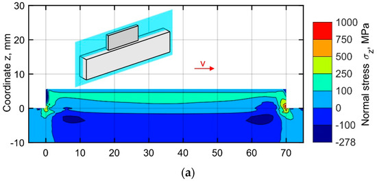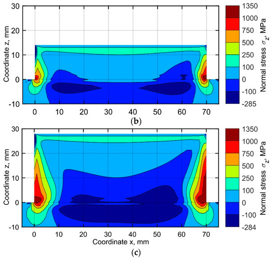 The simulated distribution of the normal stresses σz in the central longitudinal-section of the buildup (located at y = 1.6 mm), corresponding to the end of the cooling stage after 10, 25, and 50 layers, are shown in Figure 9a–c. The normal stress has a significantly lower value almost everywhere compared to the longitudinal stress, as the deposited metal expands freely in vertical direction. A distinctive feature is the formation of two regions of tensile stress concentration at the buildup ends. The asymmetry of the field is explained by the unidirectional deposition strategy. As shown in Figure 9, the size of these regions and the peak value of the tensile stress increase layer-by-layer due to the increase of the bending moment generated by the shrinkage of each pass in the longitudinal direction during cooling. A gradual layer-by-layer increase of the bending moment results in an active plastic deformation at the ends of the buildup. The tensile stress is balanced by a region of compressive stresses forming gradually in the substrate and the buildup. The peak tensile residual stresses, exceed the yield stress at room temperature by approximately 35%, corresponding to the end of the buildup on the right-hand side, where the depositing passes are completed.