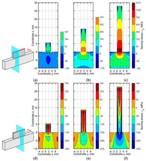 Normal stress distribution in the cross-section (a–c) near the buildup end and (d–f) in the middle part at the time corresponding to the end of the cooling after (a,d) 10, (b,e) 25, and (c,f) 50 layers.