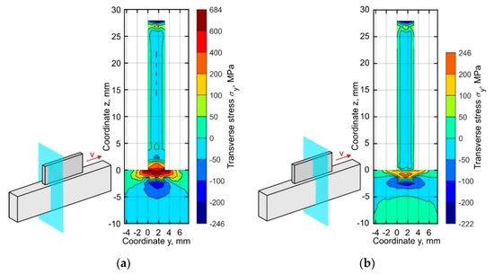 A detailed analysis of the transverse stresses σy distribution showed that these vary around 0 MPa by ±50 MPa almost throughout the entire buildup, as shown in Figure 12. The concentration of tensile stress, however, is observed near the top surface of substrate. At the buildup ends, the tensile stress level is found to be several times higher than in the middle section.