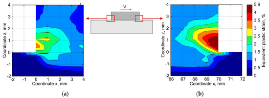 Distribution of the residual equivalent plastic strain near the ends of the buildup corresponding to (a) the start and (b) end of the pass depositing.
