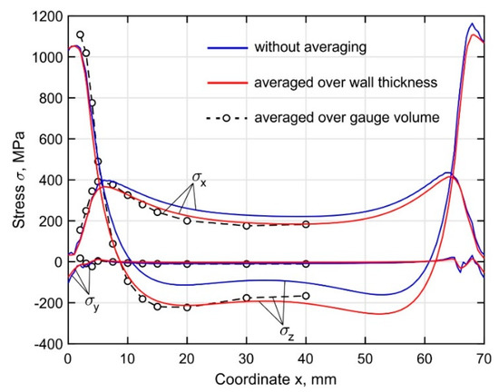 The experimental methods of stress measurement provide averaged values of the stresses along the gauge length or volume. In the case of the neutron diffraction method, the gauge volume was 1.5(x) × 3(y) × 1.5(z) mm3. It is important to understand that the real residual stress field is inhomogeneous and averaged during the experimental measurements, which can have subsequent influence on the validation of the simulation procedure. Figure 14 shows the distribution of the calculated residual stresses along the length of the buildup at a distance of 2 mm from the substrate for the following cases: (1) without averaging, i.e., stress distribution along the line with coordinates y = 1.6 mm and z = 2 mm; (2) after averaging over the buildup thickness; (3) after averaging according to the gauge volume dimensions at the points of experimental stress measurement. Obviously, the value of the resultant stresses averaged over the wall thickness is affected only by the stress distribution over the thickness, i.e., in the transverse direction along the y-axis. In the case of averaging over the gauge volume, an additional effect is produced by the stress gradients in vertical and longitudinal directions. The normal stress σz curve is not balanced without averaging due to the force-momentum equilibrium condition, which must be satisfied for the entire longitudinal section rather than for a single line. At a distance of more than 10 mm from the buildup ends, a discrepancy between the curves is observed, caused by an increase in the non-uniformity of the through-thickness stress distribution, as observed in Figure 10, Figure 11 and Figure 12. The curves representing the averaged results show a balanced distribution. At a distance of less than 5 mm from the buildup ends, the curves practically merge, as the stresses are uniformly distributed across the thickness.