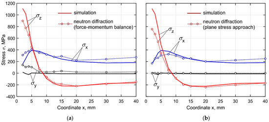 Comparison of the numerically obtained and experimental measured curves of the residual stresses components along the length of the buildup at a distance of 2 mm from the substrate. (a)~force-momentum balance approach. (b) plane stress approach.