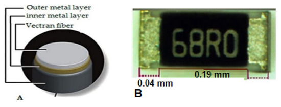 Silver coated Vectran (Liberator® 40) (A), 68 Ω Cermet resistor SMD (B).