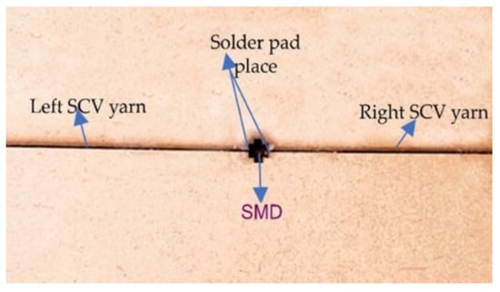 During the soldering process, there was an overlap of the terminal part of the SMD resistor and the SCV conductive yarn. An intermetallic bond or solder pad was formed due to the reaction between the solder paste, the terminal of the SMD resistor, and the conductive yarn, as shown in Figure 7. For utilizing the conductive connections between the conductive track lines and SMD elements, it was important to examine and optimize the resistance of the solder pad.