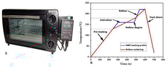 Bench top of the reflow oven (A), temperature profile of the reflow oven (B).