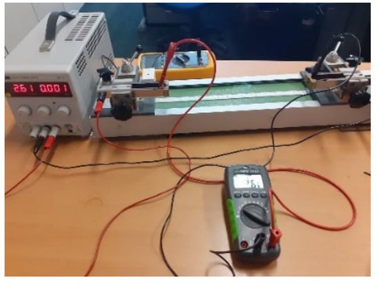 The electrical characteristics of conductive yarns are an important design factor that is influenced by the physical, electro-mechanical, and chemical properties of the material [30,31]. Electrically conductive textile material manufactured from a conductive yarn requires a perfect characterization for the design and manufacturing of safe and consistently reliable products.