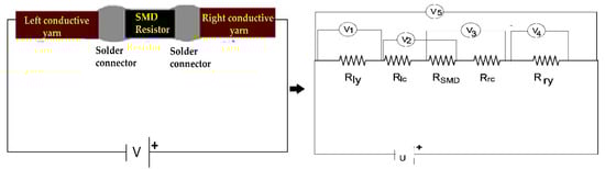 where is the total electrical resistance of the E-yarn, is the left conductive yarn resistance, is the left connector resistance, (which was 68 Ω) is the SMD resistor resistance, is the right connector resistance and, is the right conductive yarn resistance.