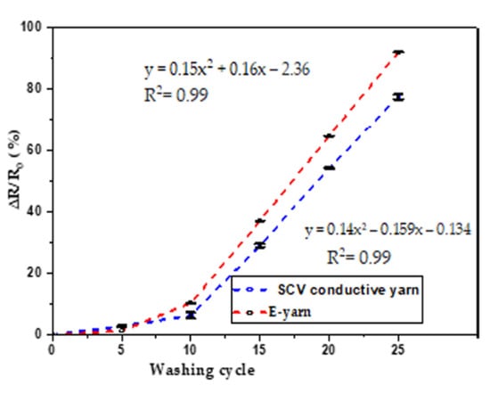 From Figure 13, it can be seen that starting from 0 to 10 washing cycle, the variation tendency of the washing cycle on electrical resistance of both the SCV conductive yarn and E-yarn was small. There was a small increase in electrical resistance for both samples after each washing cycle and their resistance increased by a magnitude of 6% for SCV conductive yarn and 10% for E-yarn before 10 wash cycles. The statistical result at alpha = 0.05 showed that electrical resistance increased slightly with each washing cycle and it was statically significant (p < 0.001). After 15 washing cycles, at alpha = 0.05, the statistical analysis confirmed that the dependent resistance on the washing cycle determined by ANOVA was highly significant (i.e., p < 0.001). In addition, the regression analysis showed that the effects of washing on electrical resistance gradually grew after 10 washing cycles. The R2 = 0.99 showed that there was a strong positive correlation between the washing cycle and electrical resistance. This was due to the effects of laundering on the individual fibers, which caused movement and damage across the SCV-conductive structures. Part of the mechanical action during washing is similar to abrasion presented before, and which also increases the resistance. Furthermore, washing might result in surface fractures on the SCV-conductive yarns as well as deformation along the SMD transmission lines. As a result of this, there would be an increase in electrical resistance or conductor line discontinuities. After each washing cycle, the electrical resistance of all samples was increased [45]. After 25 wash cycles, the electrical resistance of both the SCV-conductive yarn and the E yarn increased by 77.4% and 91.94%, respectively.