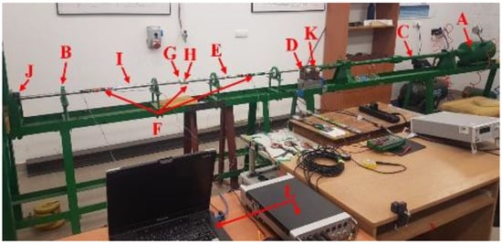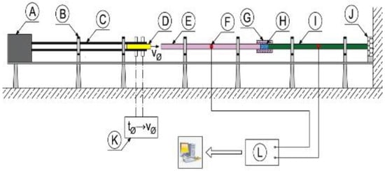 In order to facilitate the identification of individual elements of the experimental stand presented in Figure 1 and Figure 2, the letters from A to L were used. The bar projectile/striker (D) moves in the barrel of the launcher and increases its speed as a result of frontal pressure; the compressed air is rapidly released from the pneumatic gun—compressed air is supplied by the compressor (A). At the moment of leaving the barrel of the launcher, the time is measured which allows one to determine the speed of the bar projectile/striker at the moment of hitting the initiating bar. The laser light beam (K) measures the time that the bar projectile/striker has traveled the previously known measurement distance, e.g., 0.1 m. When the front of the bar projectile/striker hits the front of the initiating bar (E), an elastic wave is generated having a compressive nature (the incident wave is responsible for the formation of the initiating bar deformation ), which further moves along this initiating bar toward the tested sample soil (H) placed in a casing/tube (G) dedicated to a given experiment. When the wave reaches the end of the initiating bar, the phenomenon of partial wave passage through the tested soil sample toward the transmitting bar (I) takes place (the transmitting wave is responsible for the deformation of the transmitting bar ). The remaining part of the generated wave is partially reflected—it carries out the return path to the beginning of the front of the initiating bar (the reflected wave is responsible for the deformation in the initiating bar ). The first part of the wave finally reaches the shock absorber (J) passing its path through the test sample and the entire length of the transmitting bar. The generated pulses received from the strain gauges are recorded and saved using a multi-channel conditioner and recorder (L). Ultimately, the data in the form of a digital signal will be transferred to dedicated computer software. The illustration of the described phenomenon is schematically shown in Figure 3 [70].