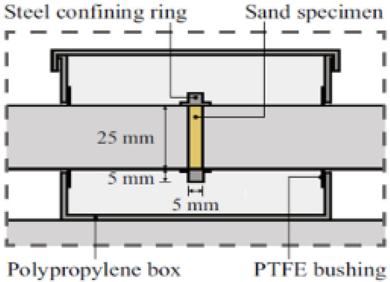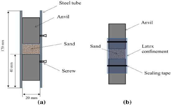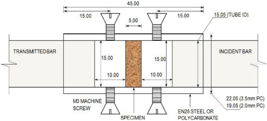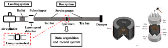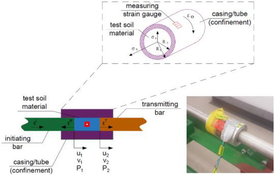 During the dynamic test using the SHPB stand, certain specific standards are applied—the test sample in the experiment has a cylindrical shape. For the duration of the experiment, the soil sample is kept in the casing/tube (Figure 4 [71])—various materials are used to make the casing/tube, adapted to the conditions of a given test, e.g., steel or duralumin. The characteristics of the material used and the ratio of the thickness and length of the casing/tube allow for uniaxial deformation of the soil sample at the moment of pressing the front initiating and transmitting bars on both sides of the tested sample fronts.