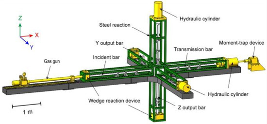 The SHPB stand is designed, depending on its configuration, to test construction materials for dynamic effects—metal [4,5,6,7,8,9,10,11,12,13,14,15,16], concrete [17,18,19,20], wood, rocks [21,22,23,24,25,26,27,28,29], soil [30,31,32,33,34,35,36,37,38,39,40,41,42,43,44,45,46,47,48,49,50] and other materials such as polymers, ceramics, etc. [51,52,53,54,55,56,57,58].