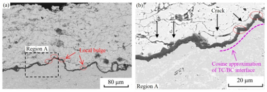The cross-sectional morphology of APS TBC [50]: (a) local bulges at the TC/BC interface and (b) a magnification perspective of image in the region A.