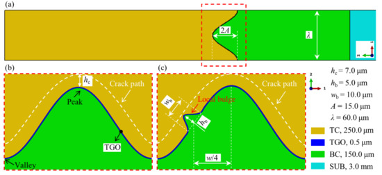 Here, the APS TBC is sprayed on nickel-based superalloy substrate (SUB) of 3.0 mm thickness. Figure 2 demonstrates the geometric model of the TBC system. The thicknesses of TC and BC are about 250.0 μm and 150.0 μm, respectively. The overall model is shown in Figure 2a. The interface morphology between TC and BC is often approximated by a cosine curve [23,36,45,52]. In this work, a cosine wave is investigated. Its wavelength and amplitude are 60.0 μm and 15.0 μm, respectively. The ceramic layer prepared by APS is stacked by lamellae. The inter-lamella crack near the TC/BC interface tends to be parallel to the interface. The crack propagation occurs under thermal shock condition [53,54]. Therefore, the cracking path in the ceramic layer in this study is considered to be parallel to the TC/BC interface. Figure 2b shows the cracking path near the TC/BC interface without bulge. Its normal distance to the interface is 7.0 μm. Figure 2c exhibits a geometrical model with one bulge in the middle of the TC/BC interface. The highest position of the bulge is perpendicular to the interface. Its height and bottom width are 5.0 μm and 10.0 μm, respectively. In this study, the bulge on the TC/BC interface has three locations: near-valley, middle, and near-peak. The distance between the bottom center points of these positions is 10.0 μm parallel to the interface. In order to prevent the early formation of mixed oxides during the thermal test, a uniform and dense α-Al2O3 layer is obtained after the coating deposition [12,55]. The initial TGO thickness in Figure 2 is 0.5 μm.