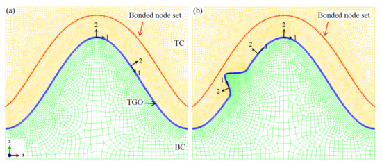 The ceramic cracking simulation near the TC/BC interface is realized by the surface-based cohesive interaction in ABAQU software (6.14 version, Dassault systemes, Providence, RI, USA) [56]. This method does not require the existence of initial cracks. When the stress of the element exceeds the allowable stress of the material, the damage occurs. If the cumulative strain energy exceeds the fracture toughness, the node pairs appearing on the cracking path in Figure 3 are released to form cracks. This method has been used to investigate the interface damage in the TBC [57]. Detailed information about this method can be found [58]. In this study, the fracture stress of the ceramic layer is 100 MPa [43,59,60]. Its critical fracture energy is 10 J/m2 [38,61]. The maximum nominal stress criterion is used to describe the crack initiation. The power law is adopted to evaluate the mixed-mode behavior of crack. It is assumed that the components of fracture stress and fracture energy in all directions are equal [38,62]. The exponent of the power-law is 1.0 [45,54].