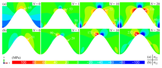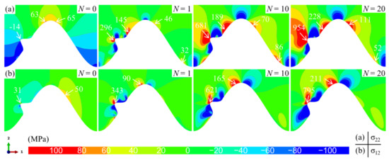 Under the current condition, the stress distributions in the ceramic layer near the standard cosine interface without bulge are first studied, which is used to compare the results in the model with the bulge. Figure 5 shows the evolution of normal and shear stress distribution near the bulge-free interface with the thermal cycle. For the normal stress (see Figure 5a), when the model is cooled from the initial temperature to room temperature (N = 0), the tensile stress is located at the peak, and the valley is compressed, which is attributed to the larger shrinkage strain of the substrate compared with the ceramic layer. After one cycle (N = 1), the tensile stress shifts to both sides of the peak. As the thermal cycle progresses, the stress state near the interface basically no longer changes. However, the magnitude of tensile stress increases continuously, which is mainly attributed to the TGO growth at high temperature [23,45,62]. For the shear stress (see Figure 5b), it is always on both sides of the peak. Its magnitude increases with the thermal cycles.