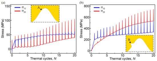 Variation of the normal and shear stress near the interface with the thermal cycles: (a) at point A near the interface without bulge and (b) at point B near the interface with one bulge.