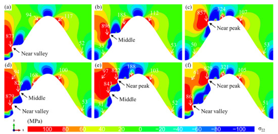 Effects of the location and number of bulges on the σ22 normal stress distribution (N = 20, at room temperature): (a–c) one bulge at the interface and (d–f) two bulges at the interface.