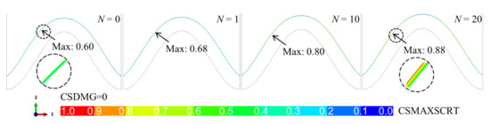 When there is no bulge on the interface, the stress in the ceramic layer does not increase much with the thermal cycle. After 20 cycles (N = 20), the stress magnitude is much lower than that in the model with a bulge (see Figure 7). This indicates that the possibility of ceramic cracking in the model without a bulge is much lower than that with a bulge. When there is no bulge on the interface, the low stress may not cause ceramic damage degradation, namely, CSDMG = 0. Figure 9 shows the variation of CSMAXSCRT along the cracking path in the model without a bulge. It is found that the maximum damage position appears on the left side of the peak, which is the same as the position of the maximum stress. The value of CSMAXSCRT increases continuously with the thermal cycle. After 20 cycles (N = 20), the maximum value is 0.88, indicating that the ceramic cracking does not occur in the model without a bulge.