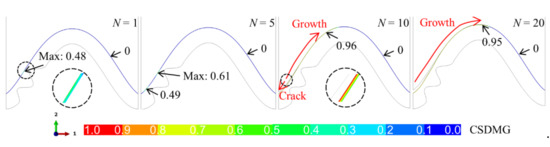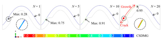 When there is a bulge in the middle of the interface, the huge tensile and shear stress near the bulge leads to damage degradation in the ceramic layer, as shown in Figure 10. It can be seen that when the system undergoes one thermal cycle (N = 1), the value of CSDMG near the top of the bulge is 0.28, which indicates that the damage degradation in the ceramic layer has occurred. The value of CSDMG increases with thermal cycling. When the cycle number reaches 10 (N = 10), the CSDMG has reached 0.91, which means that the ceramic cracking is about to occur. When the system undergoes more thermal cycles, the crack appears in the coating. It expands to the valley and peak. In a limited thermal cycle, the crack quickly propagates to the valley. Subsequently, the crack continues to expand to the peak. When the cycle number is equal to 20 (N = 20), the crack propagates to the near-peak. As the thermal cycle progresses, the CSDMG value in the right half of the model is always zero, indicating that the ceramic cracking in the left side does not affect the right side.