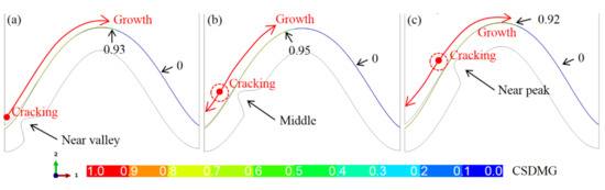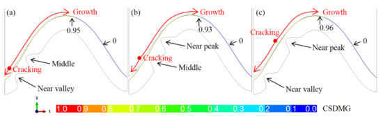 Besides the total length of the crack, the bulge location may also affect the cracking moment. Figure 12 shows the CSDMG distribution on the crack path and the change of the total crack length with the thermal cycles. It can be seen from Figure 12a that if there is no bulge on the interface, the CSDMG on the whole cracking path is 0.0. When the bulge is located near the valley or peak, the cracking area (CSDMG = 1.0) is significantly larger than that with a bulge in the middle of the interface. In addition, the damage degradation region (CSDMG > 0.0) on the cracking path is also obviously larger. It can be found from Figure 12b that the existence of bulge leads to the rapid increase in crack length, which is independent of the location of the bulge. When crack propagates to the near-peak region, the effect of the bulge is obviously weakened, so the total length of the crack increases at a lower rate with the thermal cycling.