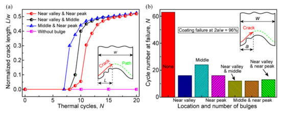 In order to quantitatively reveal the effect of the bulge on the coating failure, Figure 15 shows the effects of the location and number of the bulge on the crack evolution. It can be seen from Figure 15a that the early cracking of the ceramic layer occurs after several cycles, which is independent of the distribution location of two bulges. Before the crack propagation reaches the peak, the crack length shows a sharp increase, which is different from the effect of a single bulge on crack propagation (see Figure 12b). Moreover, the crack propagation rate is also higher than that in the case of only a single bulge. It can be found from Figure 15b that when there is no bulge on the interface, the coating failure occurs after 63 cycles (N = 63). However, when a bulge appears at the near-peak or near-valley location, the coating failure occurs after 16 cycles (N = 16). If two bulges appear on the interface, the number of thermal cycles at failure will be further reduced, which is independent of the bulge distribution.