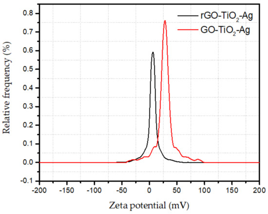 GO-TiO2-Ag and rGO-TiO2-Ag nanocomposites were prepared by the hydrothermal approach based on our previous research [45]. Briefly, 0.25 g of GO was dispersed in 250 mL of deionized water by ultrasonic stirring for approximately 2 h. Separately, 10 mL of titanium isopropoxide (TTIP) and silver was combined with 10 mL of isopropyl alcohol, and this solution was added to 50 mL of GO suspension. After that, 10 mL of 0.2 M AgNO3 was added dropwise to the solution. The solution was then mixed and stirred for 30 min, and the pH was altered to 1.1 while stirring was continued for about 2 h to produce a uniform homogeneous solution. This homogeneous solution was heated at 160 °C for 24 h in a Teflon-lined stainless-steel autoclave. Next, the substance was vigorously sprayed with ethanol and then washed with water to remove all traces and unreacted ions. The GO-TiO2-Ag nanocomposites were obtained, the solution was purified and dried at 80 °C. The composition of GO/rGO:TiO2:Ag was roughly estimated to be about 5:1:1 parts by weight. The main difference between the rGO-TiO2-Ag and the rGO-TiO2-Ag nanocomposites was the addition of ammonia and hydrazine. These compounds were used to remove oxygen molecules from GO sheets as well as their functional groups. The detailed characterizations are presented in our previous work [45].