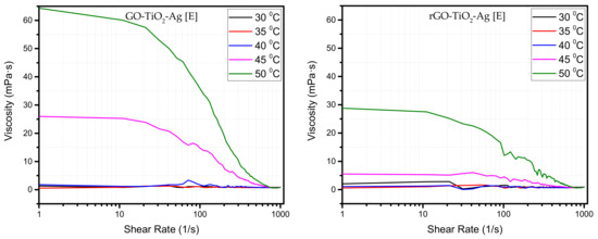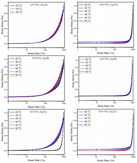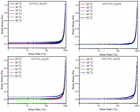 The shear stress and shear strain are a function of concentration and temperature. Studies have revealed that the water-based nanofluids behave as a Newtonian fluid at a lower concentration of nanoparticles in the fluid [65] and as a non-Newtonian fluid at a higher concentration. The nanofluids behaved as shear thickening fluids when the concentration of the nanoparticles decreased [66]. The plots in Figure 5 show the various shear stress versus shear strain at different temperatures. A side-by-side comparison between the GO- and rGO-based ternary hybrid nanofluids is made. The GO-based ternary hybrid nanofluid behaves almost like a Newtonian fluid for sample A at temperatures ranging from 25 to 50 °C, while the rGO-based ternary hybrid nanofluids behave like shear-thickening or dilatant fluids for the same concentration for all temperatures. In the following plot for the second concentration (sample B), the GO-based ternary hybrid nanofluids at lower temperatures of 25 °C behave like Newtonian fluids but start to show slight shear thickening behavior once the temperature is increased till the maximum measured temperature of 50 °C.