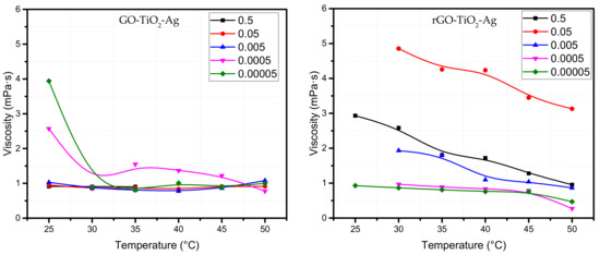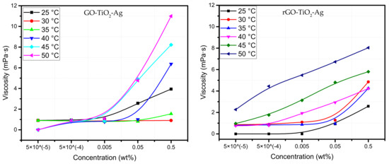The viscosity of water, EG, and oil-based nanofluids decreasing with the fluid’s increase in temperature is a known phenomenon. The rate of decrease in viscosity due to an increase in temperature depends on the fluid’s intrinsic property or the intermolecular bond strength. The increase in temperature of the fluid supplies the molecules in the fluids with higher energy. In the case of nanofluids, which have additional particles, this increase of temperature leads to increased heating and heat transfer leading to faster weakening of the intermolecular forces, which decreases the fluid’s viscosity. The intermolecular interactions between the water-nanoparticle become weaker with the increase in the temperature of the fluid, leading to a decrease of viscosity in the ternary hybrid nanofluid [57]. The strong van der Waals forces act on the particles at lower temperatures. Once the temperature increases, the forces weaken, leading to a decrease in viscosity [58]. Figure 4 depicts the averaged plot of viscosity versus temperature in terms of concentration of GO- and rGO-based ternary hybrid nanofluids. It can be seen that the viscosity is almost similar except for a slight variation, with the lower concentration fluid exhibiting slightly lower viscosity at lower temperatures [59], with the viscosity decreasing to about 80% in GO-based ternary hybrids. At the same time, it is about 33% in the rGO-based THNf. It must be noted that the concentrations of THNp in the nanofluids are very minute (<1 wt%).