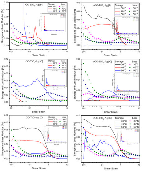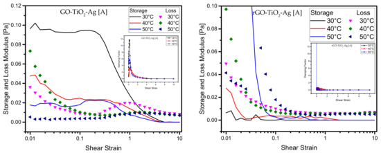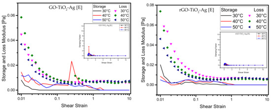 The plots in Figure 6 show the loss and storage moduli of the two GO-based ternary hybrid nanofluids. It can be seen that the curves demonstrate a similar qualitative feature with a sharp decline of high oscillating stresses and are characterized by constant modulus or linear viscoelastic plateau. It can also be seen from the plots that the loss modulus is higher in the nanofluids with higher concentrations. A crossover area between the loss and storage moduli shows the presence of yield stress in the nanofluids, as mentioned by a few studies. At higher shear strain, the G′ decreases indicating the loss of viscoelastic structure in the nanofluid. One striking feature is that at lower concentrations of both GO- and rGO-based ternary hybrid nanofluids, the loss modulus is almost similar, indicating that the nanofluids lose the ability to store stresses and remain constant at all measured temperatures. This suggests that the nanoparticles in the fluids enhance the rheological capabilities, such as storage, damping, and loss moduli in the fluids.
