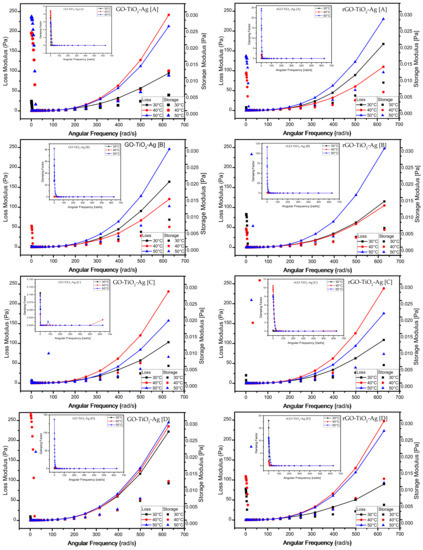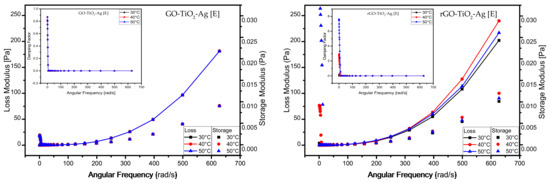 Frequency sweep tests are carried out to measure the time-dependent behavior of the nanofluids in a non-destructive deformation range. It is an essential tool to measure the stability of nanofluids. In addition, it helps to quantify zero shear viscosity for viscoelastic liquids. Frequency sweeps can be measured either by using fast-moving high-frequency simulation or by slow-moving low-frequency simulation. The frequency sweeps were measured in the LVE region with angular frequencies ranging from 0.1 to 10 Hz (0.628 to 62.831 rad/s) by applying oscillatory stress of 0.05 Pa. The loss and storage moduli are similar and practically constant in all the concentrations of the measured ternary hybrid nanofluids. The measurements show that at higher frequencies, both the storage and the loss moduli increase. The damping factor is shown in the Figure 7 insets. It can be seen that the damping factors are higher only in the viscoelastic region with low angular frequency. Once the frequency is increased, the damping factor is minimum and uniform across all the concentrations independent of temperature. Both the GO- and rGO-based ternary hybrid nanofluids exhibit a similar trend for the damping factor. The damping factor decreases exponentially with the increase in angular frequency.