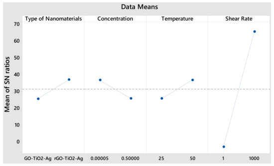 The types of nanomaterials, concentration, temperature, and shear rate were optimized using two levels of Taguchi model, and their effect on viscosity and shear stress was evaluated. The four parameters were allocated values in two levels based on the preliminary study. Table 1 summarizes the variables and their responses.