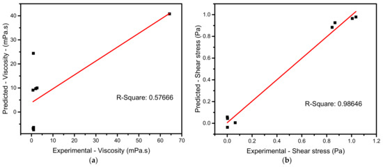 Regression prediction plots. (a) Viscosity; (b) Shear stress.
