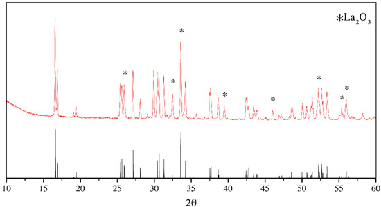 where ω is the mass fraction of La2O3. It should be noted that enthalpies, mentioned in Equation (6), are supposed to be specific, not molar. The recalculated value of the dissolution enthalpy of LLZO (with 3.1 wt.% of La2O3) is equal to −1917.7 J·g−1 or −1607.75 kJ·mol−1, Table 2.