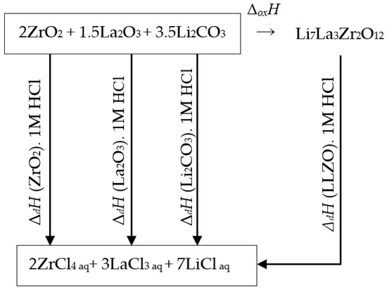 The formation enthalpy of Li7La3Zr2O12 (ΔoxHLLZO) from Li2CO3, La2O3, and ZrO2 is calculated according to Equation (1) from the Experimental Section. The subscript ox means “oxides”, which relates to the initial compounds from Equation (1).
