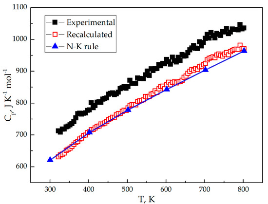 Considering Cp,298 from Table 5 and Equation (21), calculated by Equation (20) the LLZO entropy is equal to 362.3 J mol−1·K−1. The calculated value of LLZO entropy by the W. Herz rule is in good correlation with Ref. [60]. Hence, the N-K rule cannot be used for the entropy calculations, as follows from molar masses principle.
