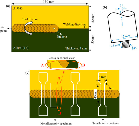Schematic of the FSW process: (a) configuration of the welding joint, (b) welding tool, and (c) the orientation of samples cutting for microstructure and mechanical testing.