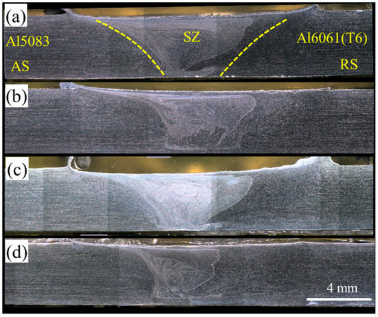 Figure 2 shows the cross-sectional macro photos of the dissimilar joint of Al5083-Al6061(T6) under different welding parameters. The macrographs presented no common welding defects, such as crack, porosity, or cavities. Notably, Al5083 was placed in AS, whereas Al601(T6) was located in RS. Three welding zones, namely, SZ, TMAZ, and HAZ, were obtained. The pin penetration was 0.3 mm, and it remained constant under all the welding conditions (Figure 2). SZ in the dissimilar FSW was evident, and the complex structure of Al5083 and Al6061(T6) was demonstrated in the SZ with a flowing shape mostly composed of an AS material (Al5083) compared with that in a similar FSWed joint [27,28].