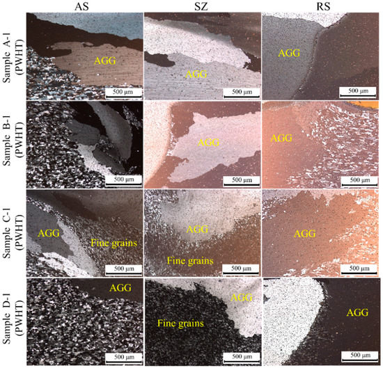 The main effect of PWHT was grain growth in the welding zones. Figure 5 shows the AS, SZ, and RS of the welding zones of the PWHTed samples under different welding parameters. The TMAZ on both sides of the welding zone, i.e., AS and RS, was not found in the microstructure of the PWHTed samples compared with that under the as-weld condition. The grain size in the SZ increased to several hundred micrometers and millimeters as observed in Figure 5.
