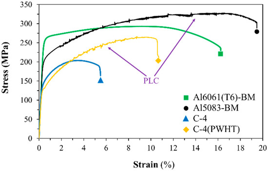 Figure 6 presents the stress–strain curves of the dissimilar FSWed, PWHTed, Al5083-BM, and Al6061(T6) samples. The PLC effect was observed as a serration behavior in the dissimilar joints before σUTS, as pointed by the arrow in Figure 6, due to plastic instability during the tensile test [23,43]. The PLC effect is due to transient interactions between mobile clouds of impurities (diffusing solute atoms) and glide dislocations [44]. An Mg atom containing Al5083 is larger than an Al atom in the Al matrix, thereby hindering the dislocation movement and increasing the strength of an Al alloy [45]. As a result, the PLC effect is linked to pinning and unpinning, whereas a pinned process occurs when barriers made from forest dislocations and grain boundaries prevent the movement of dislocation. Conversely, an unpinned process and a decrease in stress during the tensile test occur when dislocation can be overcome from the solute cloud [46]. Figure 6 shows the stress–strain curve of Sample C-4(PWHT) as a function of PWHT at a rotational speed of 1400 rpm.