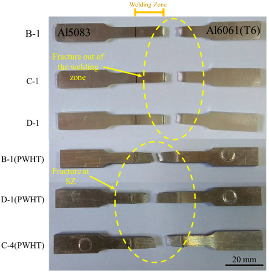 Figure 7 presents the fracture location of the dissimilar FSWed samples under different welding parameters. Fracture and necking occurred at the HAZ of Al6061(T6) in all the dissimilar joint samples. The overview of fracture location confirmed that it was outside the welding zone (Figure 7). The PWHTed samples exhibited the necking phenomenon at the fracture location. Notably, fracture and necking occurred at the interface of Al5083 and Al6061(T6) in the SZ. This finding showed that the fracture location moved from the HAZ in the as-welded samples to SZ in the PWHTed samples due to PWHT. The stress–strain curve behavior was attributed to the moving failure position (Figure 6).