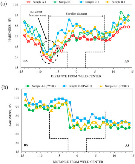 In PWHTed samples, the hardness profile was obtained with the same behavior, showing that the hardness properties were improved by PWHT (Figure 8b). Notably, the improvement of hardness properties was significant in the RS, which was Al6061(T6). The hardness properties of Al6061(T6) were enhanced because of the homogeneous distribution of precipitation hardening after PWHT [47]. However, the hardness properties of Al5083 decreased in AS because of the coarsening of the hard particle and grain growth in BM. With AGG in the welding zone after PWHT, the hardness test of the PWHTed samples showed that precipitation hardening was the main factor that increased the strength of A6061(T6) rather than the average grain size. Thus, a good agreement was observed between the results of the tensile and hardness tests. The hardness profile of the PWHTed samples showed the same properties with low fluctuation on BMs, and the lowest hardness value was located at the interface of the PWHTed samples. The fracture location of the PWHTed samples occurred at the interface of the SZ. This finding was consistent with the results obtained via the hardness test.