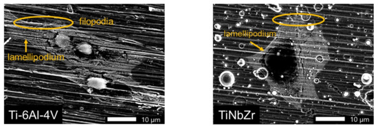 SEM images of MG-63 cells cultured on Ti-6Al-4V, TiNbZr, TiNbZrTa, TiNbZrTa(N), TiNbZrTa-O, and TiNbZrTa(N)-O for 48 h. The scale was 10 µm (1000× magnification from the raw images). The arrows indicate lamellipodia, and the circles indicate filopodia.
