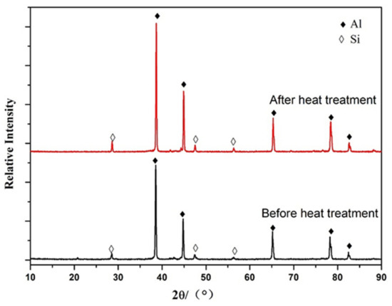 Figure 2 showed the XRD patterns of the non-heat-treated, die-cast samples before and after heat treating. According to Figure 2, the main phase composition of the sample was Al and Si. The main phases of the die-cast samples had not changed significantly by comparing the XRD patterns before and after the heat treatment.